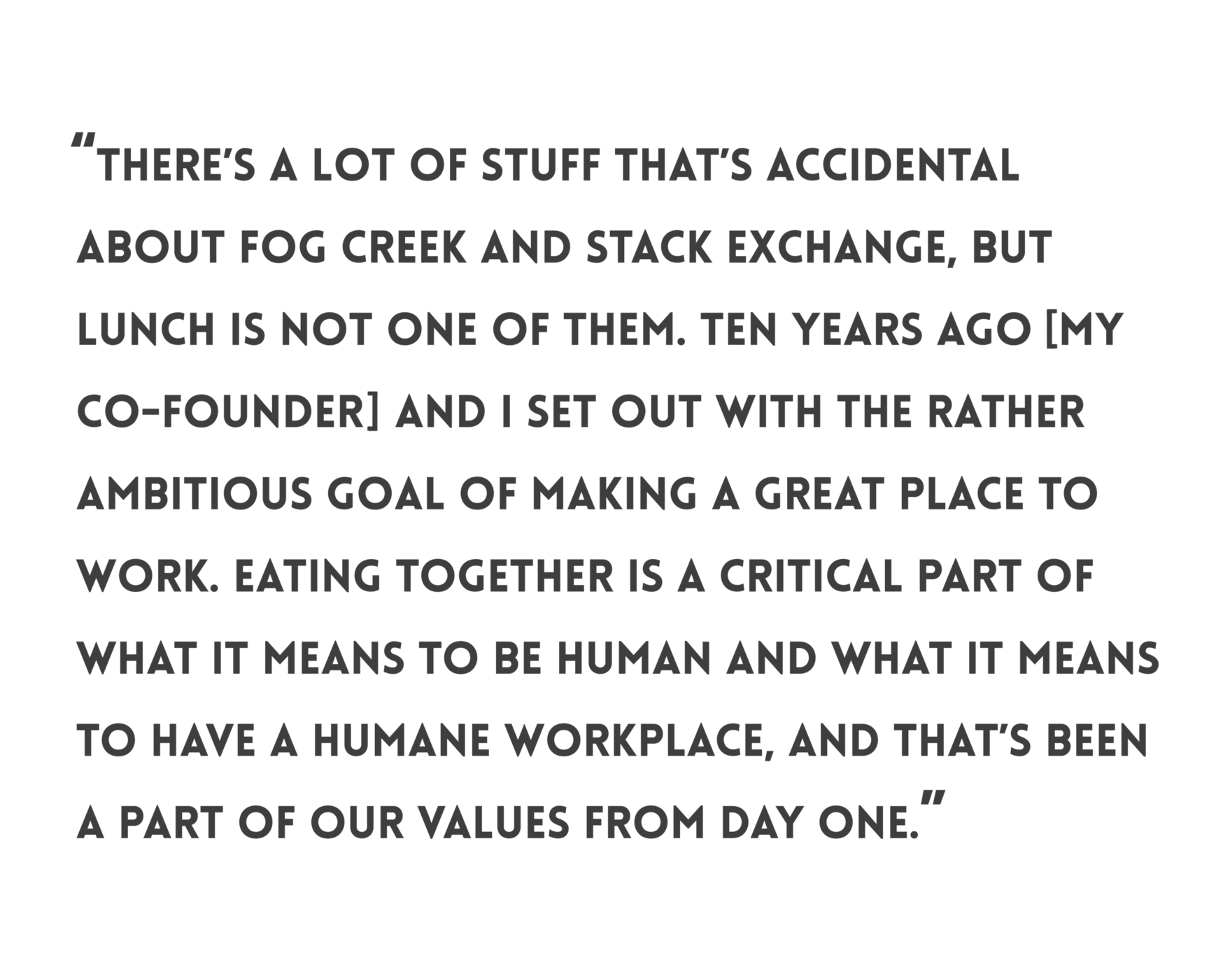 The common lunch at Stack is a way of building community and a sense of togetherness across the office. Employees talk about everything from office gossip to highly technical discussions on server frameworks. Instead of breaking off into smaller groups and rushing to get lunch outside, employees get more of a chance to connect and interact with each other. This creates an atmosphere that Stack’s CEO Joel Spolsky thinks is essential to a good workplace.